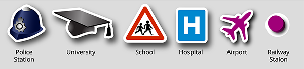 For my map of Great Britain, I created a series of icons to be used at large scales. I added a shadow to make them stand out more clearly against other features, and a white, partially transparent, ‘halo’ on the Rail Station dot to break it out of the line: