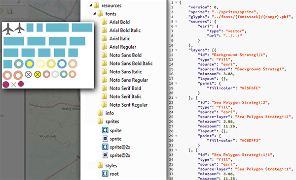 A vector tile package contains the vector tiles, and various formatting documents (In essence, the package is a zip file, so you can use an ‘Extract files’ command to ‘unzip’ it and look at the contents). Of interest to us is the Resources Folder, which includes: