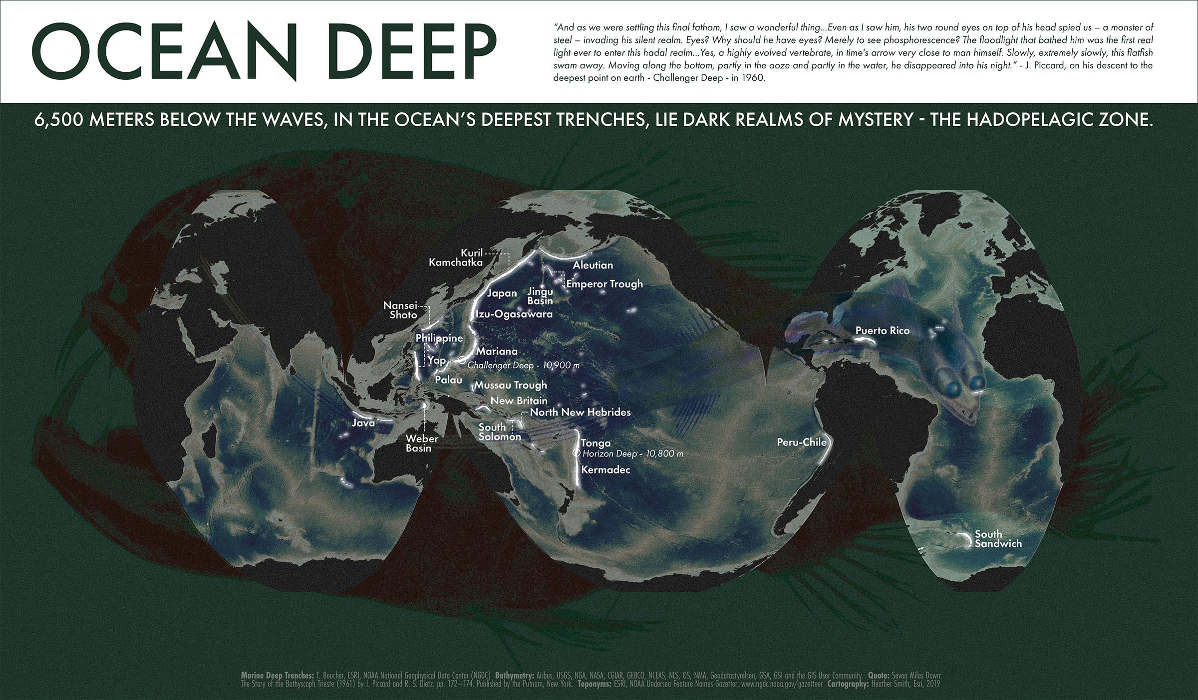 This blog will walk you through creating a map of the ocean’s deepest trenches (the hadopelagic zone) using ArcGIS map data in Adobe Photoshop.