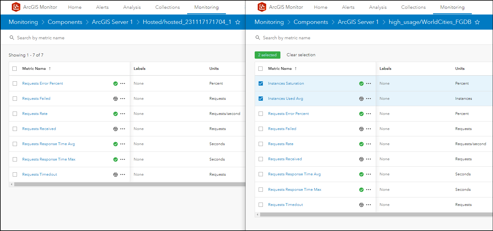 ArcGIS Monitor will collect the same metrics for hosted feature services as for referenced feature services, except for two properties: i) average instances used and ii) instance saturation percent, as these are not applicable. These two properties will not appear in Monitor for hosted feature services.