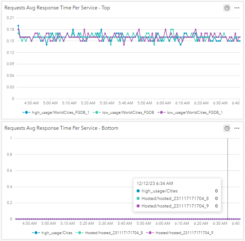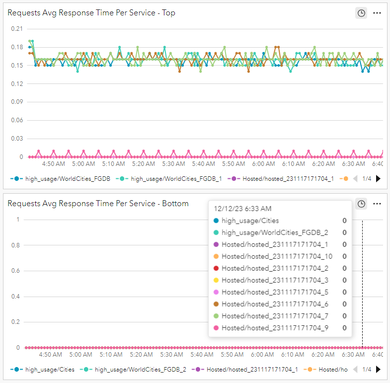 The charts in Figure 5 show the 3 services with the highest (descending) and lowest (ascending) average response time of requests. These new serial chart capabilities provides GIS managers and administrators more flexibility to configure reported metrics in Analysis views.