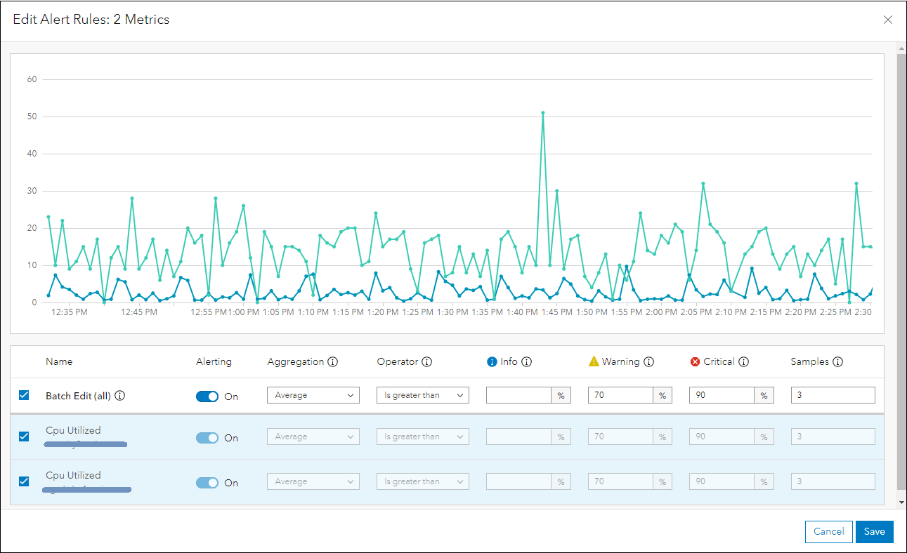 Figure 6: The CPU Utilized metric is selected for two host machines, their alert rules are edited in batch