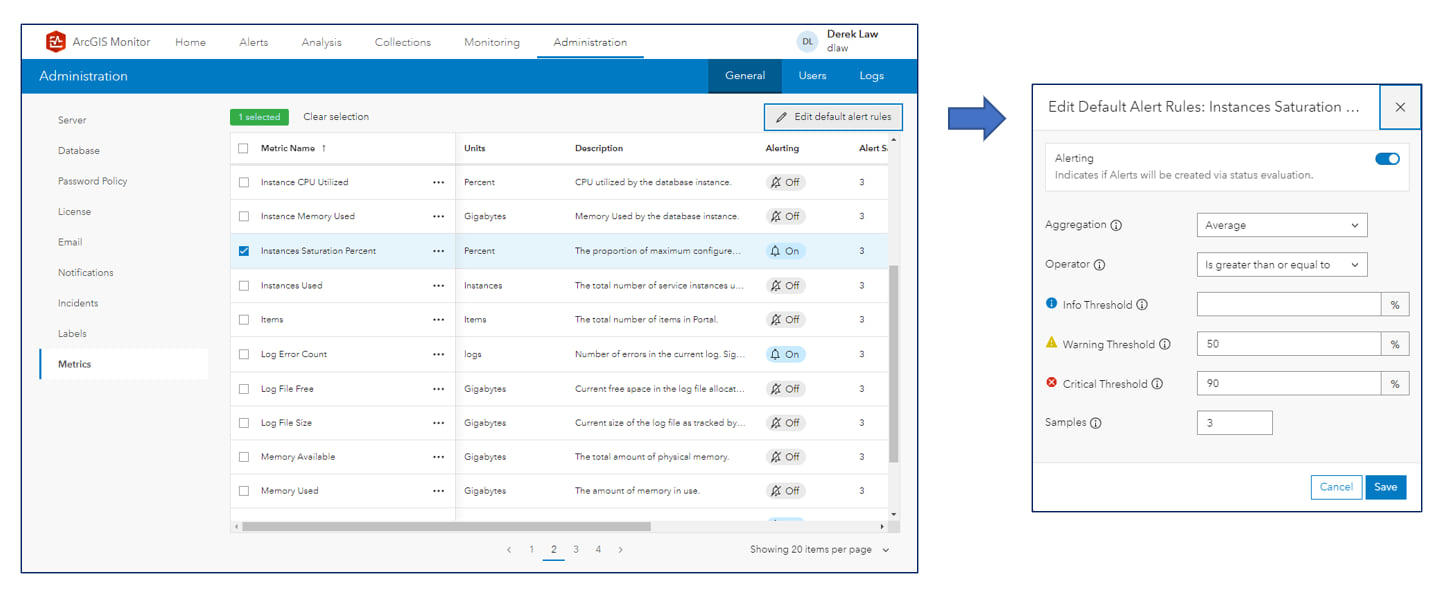 Under the Administration tab, a new section called Metrics has been added. This enables default alert rules to be configured for metrics, which are applied when a new component is registered with ArcGIS Monitor. In addition, you also have the option to apply the default alert rules to metrics for components already registered with Monitor by clicking the … More options menu for a selected metric.