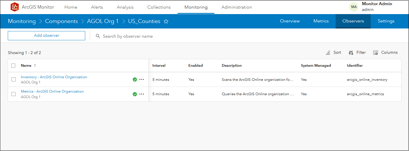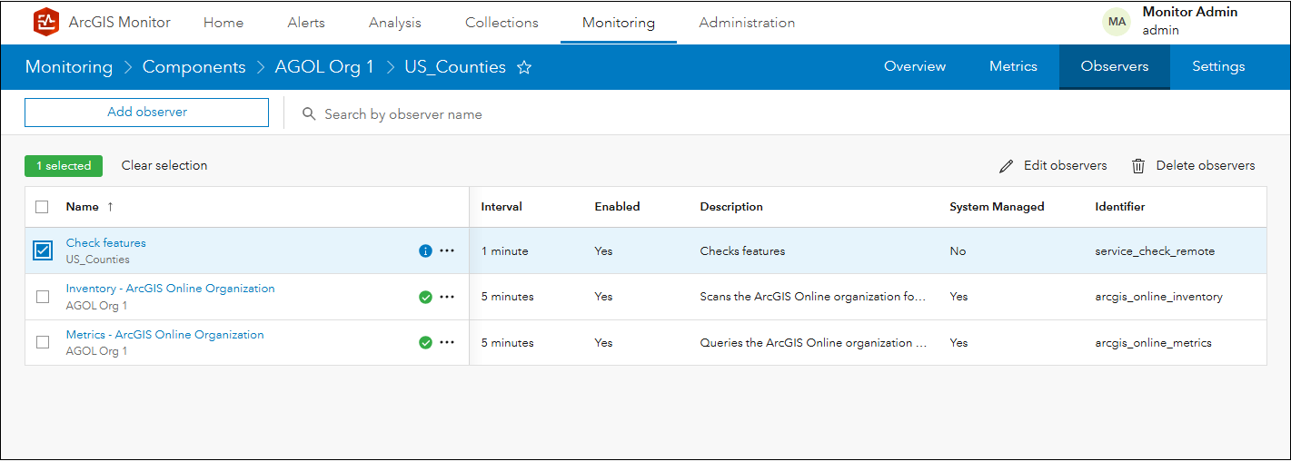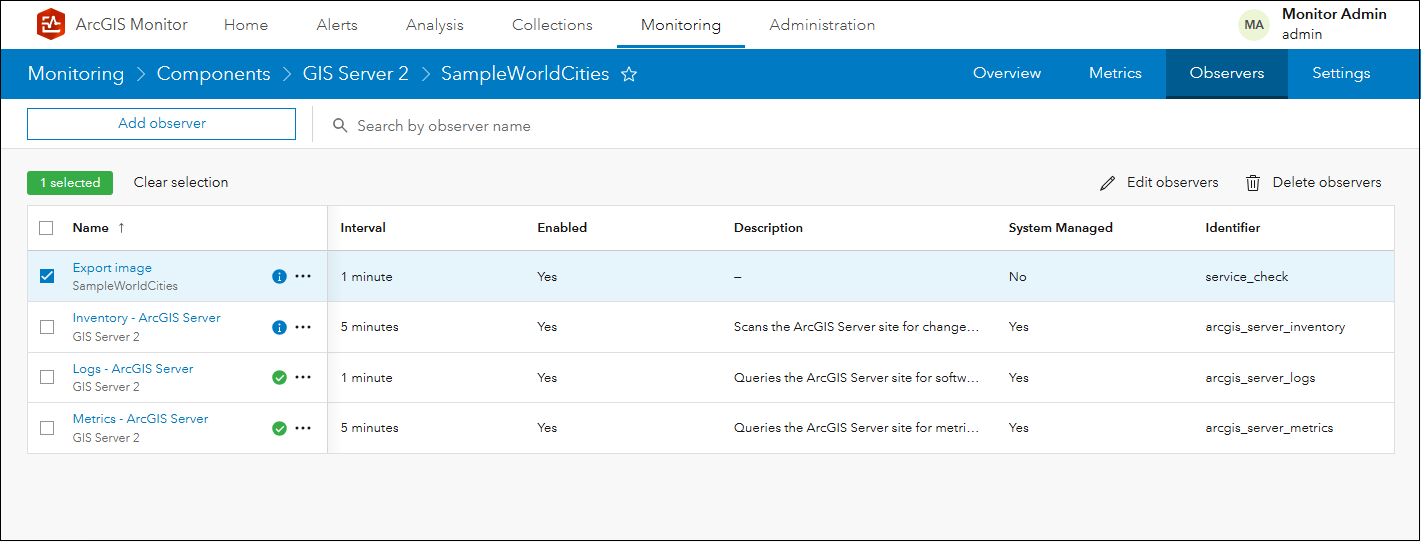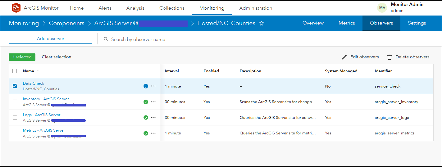 All enterprise GIS assets such as: enterprise portals, GIS Servers, services, geodatabases, and hosts become components when they are registered with ArcGIS Monitor. Every component in Monitor has observers which are responsible for collecting attribute and metric information about the component. Each component type has a unique set of observers that run at specified intervals. You can view the observers for a component by selecting the component on the Monitoring page > Observers subtab. For example, a service component in an ArcGIS Online organization has two observers: inventory and metrics.