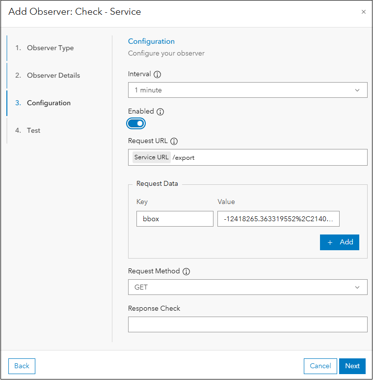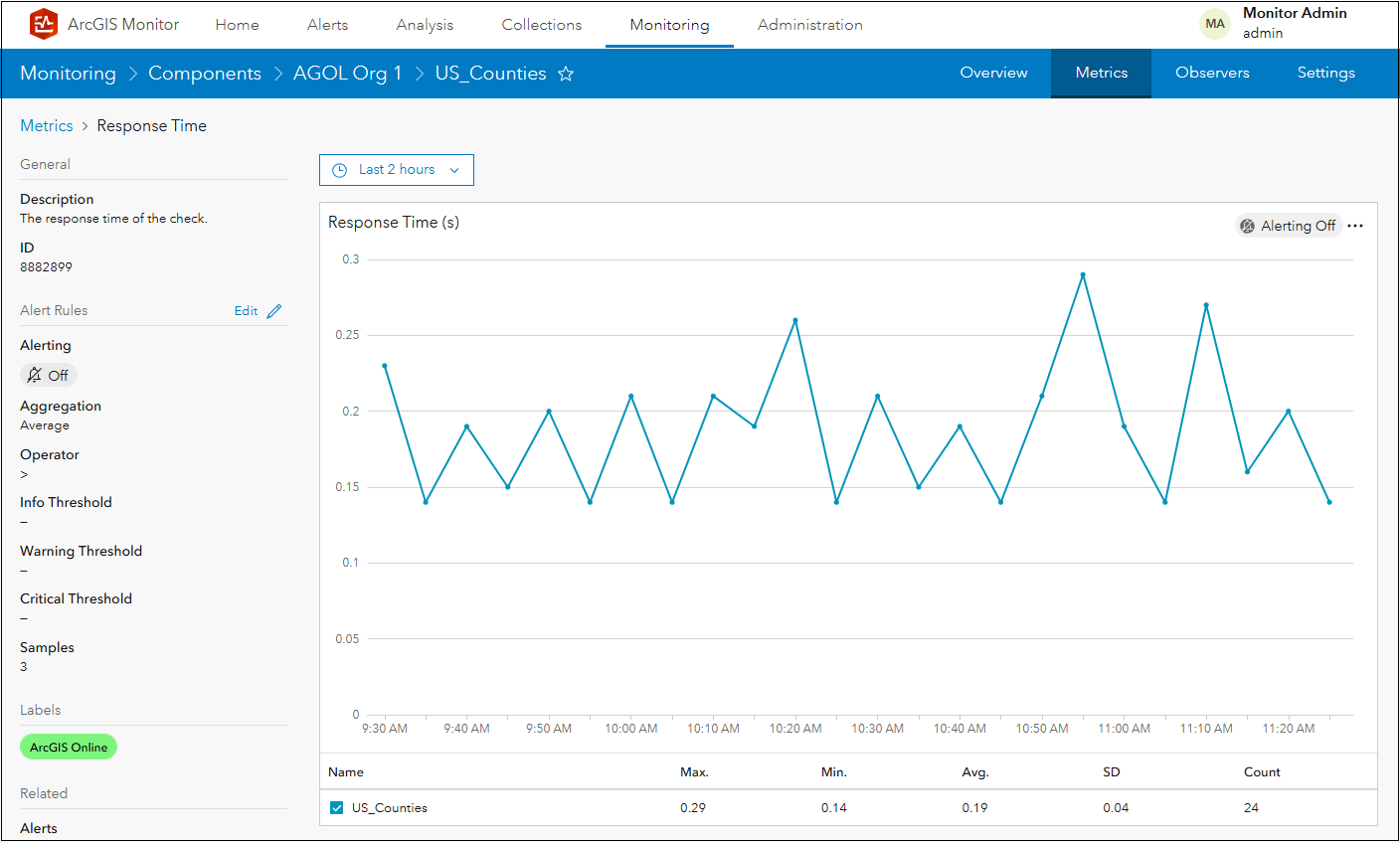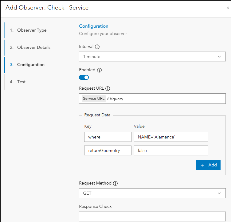 At the ArcGIS Monitor 2024.1 release, a Check-Service observer was introduced. This observer allows a Representational State Transfer (REST) request to be configured against a registered service component, which enables admins to apply requests to monitor a variety of scenarios. The observer sends the configured request and captures four metrics on a service component: check response code, check response size, check response matches and check response time. These ‘response check’ metrics can be helpful to admins for quantifying health and testing performance on Monitor service components.