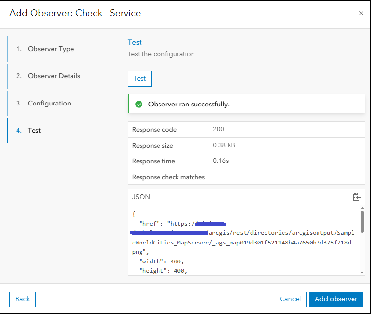 If the query successfully returned data from the SampleWorldCities service component, an “Observer ran successfully” message is displayed, along with data for each of the four metrics provided by the Check-Service observer. The response code is 200, for REST API queries this indicates that the request was successfully completed. Note the JSON response is also shown, in this case a URL to the exported image defined by the bounding box in the query.
