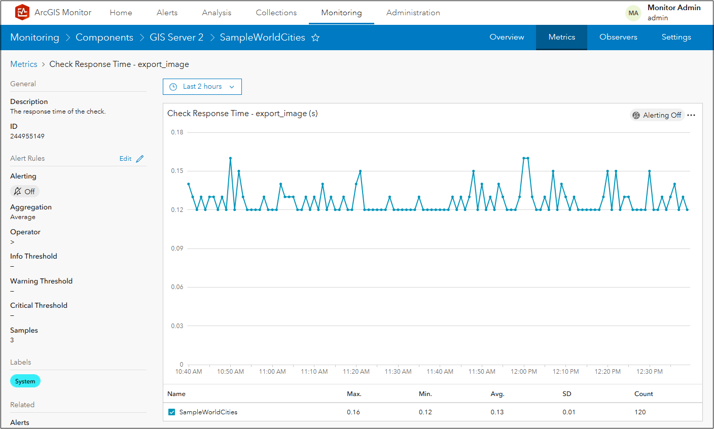 You can observe the response time for executing the Check-Service observer export image query. The resulting response time metric can be used to measure performance of the export map operation on a map service. And the response size metric can be an indicator that layers are correctly rendering within the spatial extent bounding box specified.
