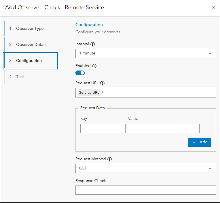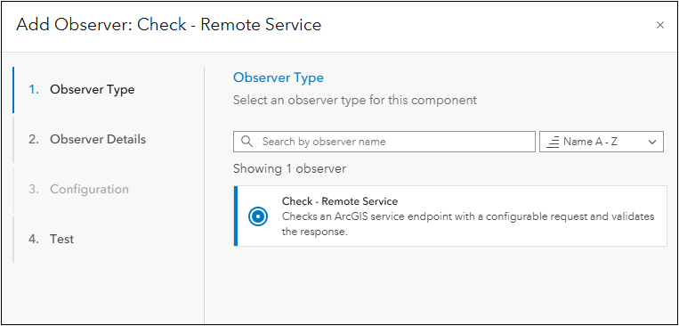 Note: In the image above, the Add Observer dialog displays Check – Remote Service option, because an ArcGIS Online service component was selected, the behavior is the same for third party ArcGIS Server site service components. However, for an ArcGIS Server service component, the dialog would display a Check – Service option.