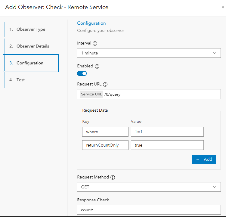 - Interval is 1 min, determines how often the configured request will be sent by the observer