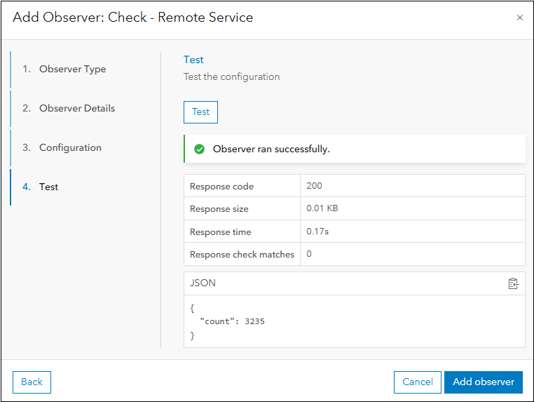 Click Next to advance to the Test panel. You can click Test to ensure the query configuration for the observer works.