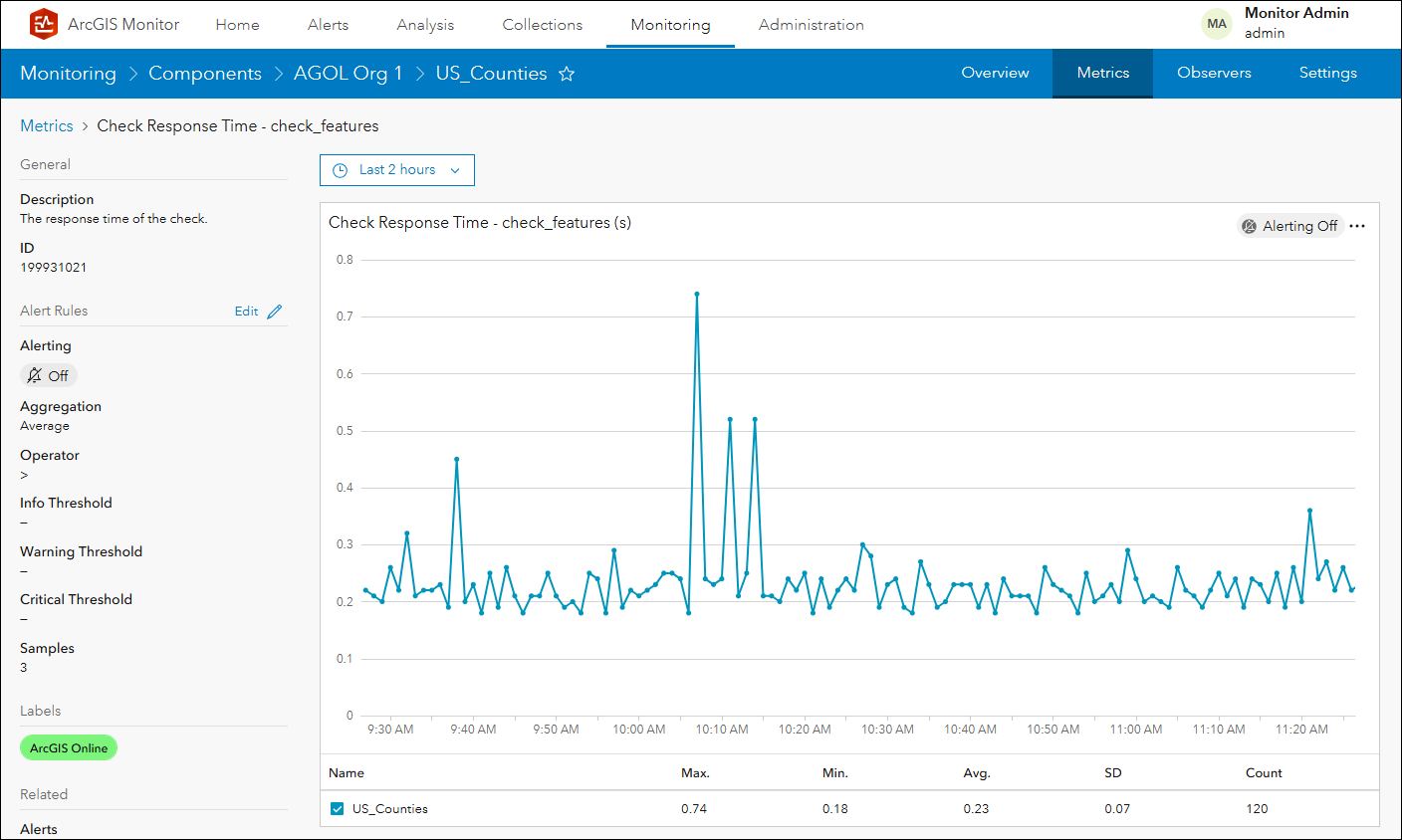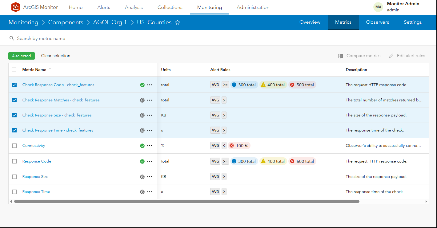 ArcGIS Monitor provides observability into your ArcGIS Enterprise deployments by collecting metrics on the health, performance, and usage of your enterprise GIS. It is designed to help administrators and managers ensure their ArcGIS Enterprise deployments are working efficiently by reducing and preventing system downtime, resulting in operational cost savings.