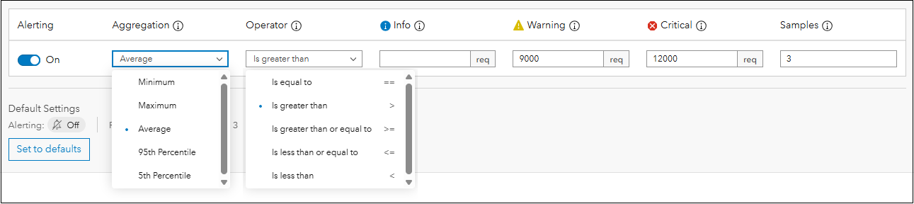 In the Edit Alert Rules window, you can turn alerting on/off for the metric and you have several options to configure alerts. First, you specify the condition which would cause the alert(s) to trigger which is a combination of aggregation – the mathematical function that will be assessed, and the operator – applied to the threshold value(s) for the alert condition. The different aggregation and operator options are shown in Figure 10.