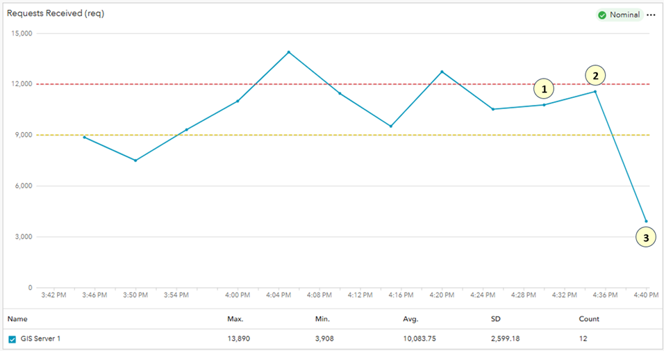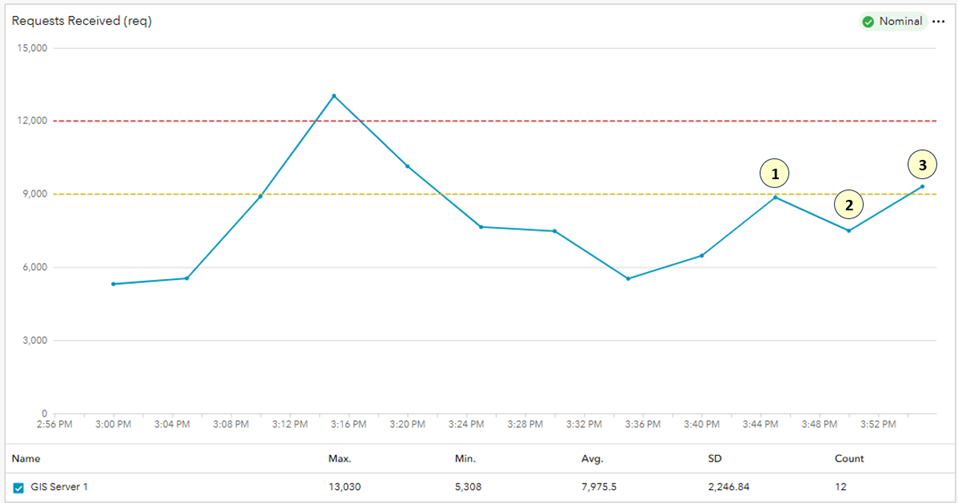 Note the three most recent data points labeled 1, 2, and 3. Their values are used by Monitor to compare against the alert condition(s) set for the metric. If the “average” value of the three data points “is greater than” the warning (9,000 requests) or critical (12,000 requests) threshold values, an alert is triggered. Currently, their average value is below the alerts set. The chart’s status pill indicator in the upper right shows nominal.