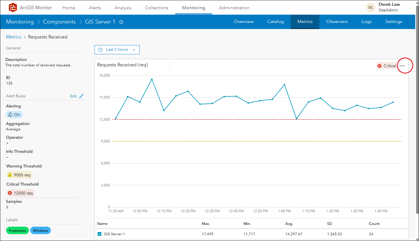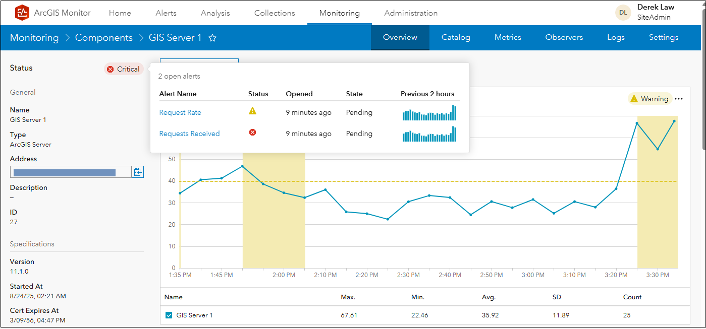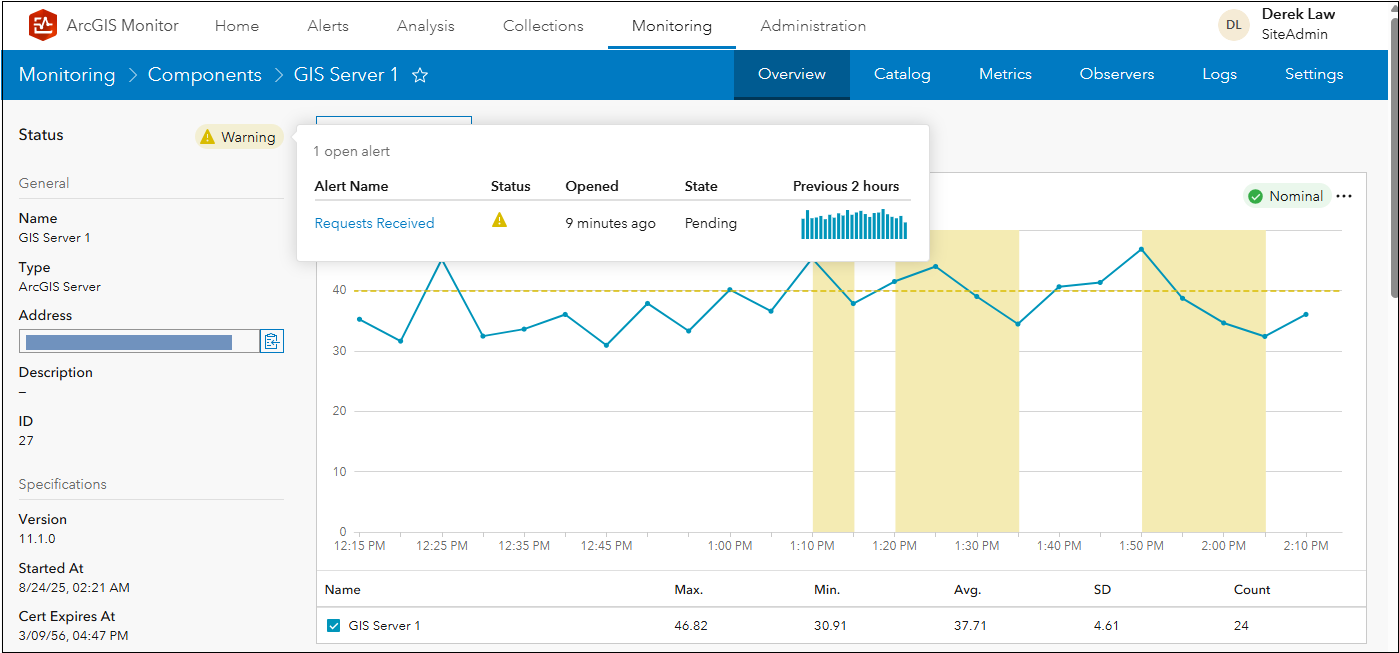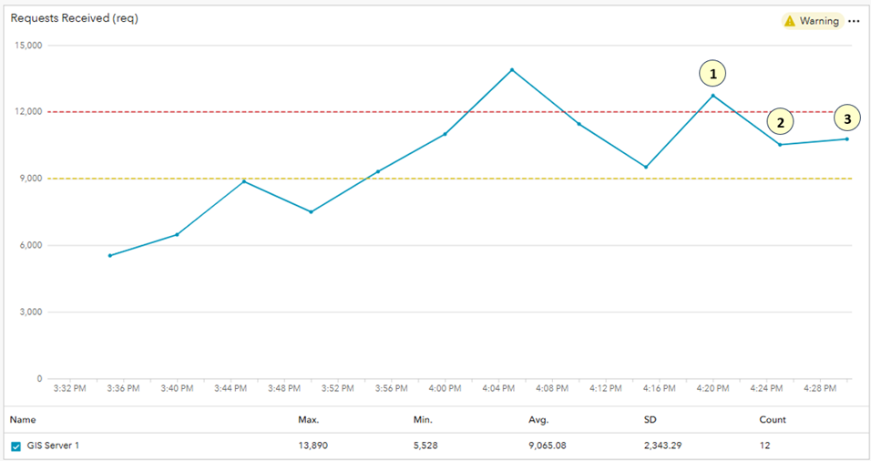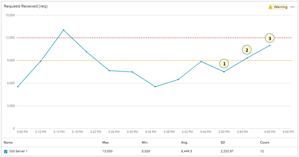 Figure 12: GIS Server 1’s requests received metric has a warning alert.