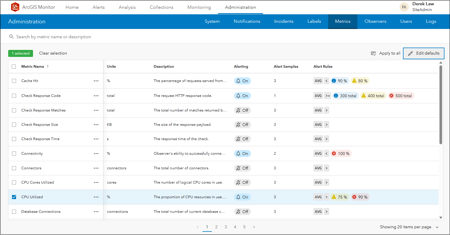 You can also configure alert rules for the same metric for multiple components of the same type in ArcGIS Monitor. Under the Administration page > Metrics subtab > select a metric in the table, then click Edit defaults.