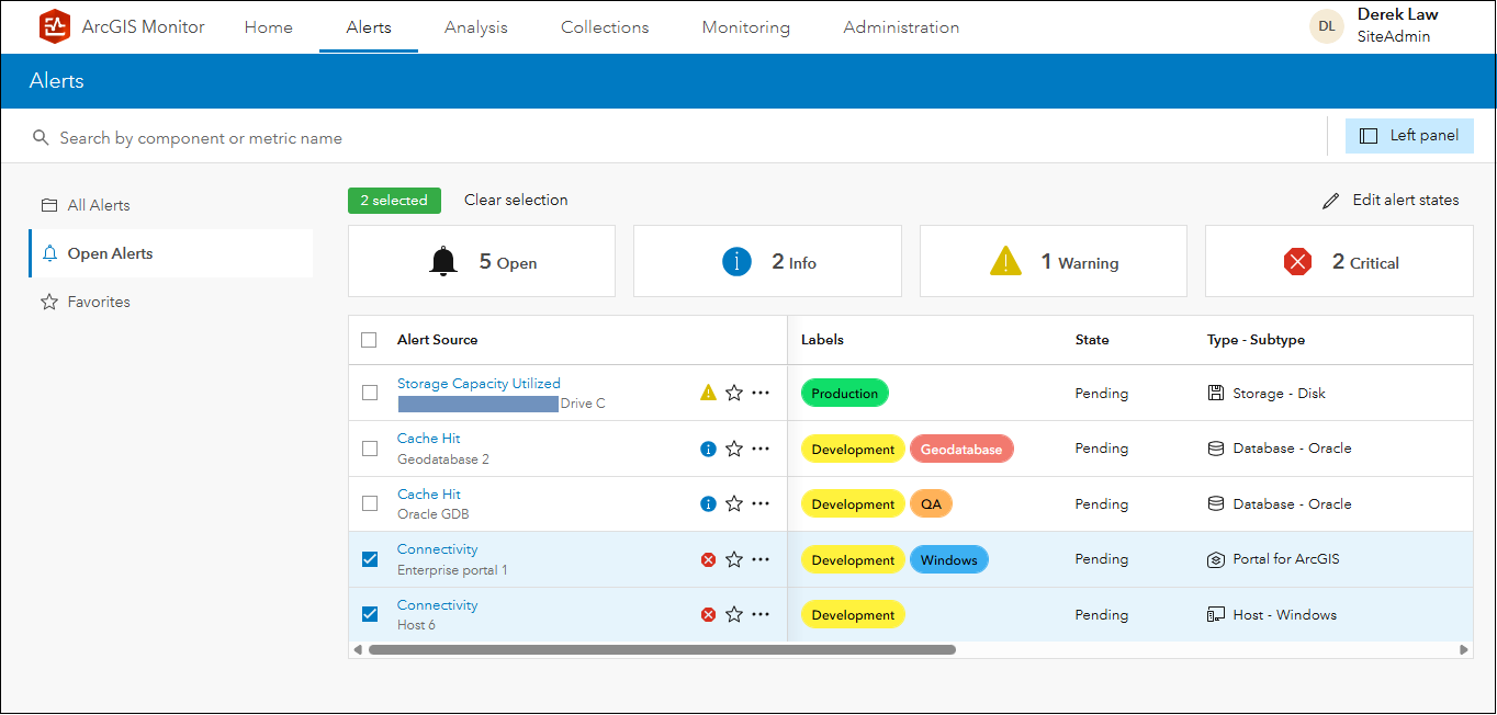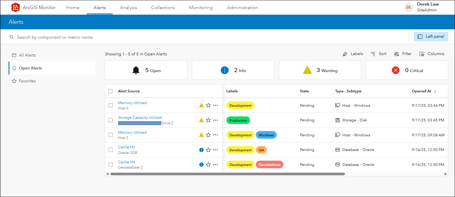 The Alerts page helps admins by aggregating and summarizing all reported alerts in your enterprise GIS. Four indicators at the top of the page denote all open alerts and the three different alert types: info, warning, and critical. The alerts table displays all alert occurrences listed alphabetically. You can easily focus on any open alerts via the filter on the left side of the page, see Figure 16.