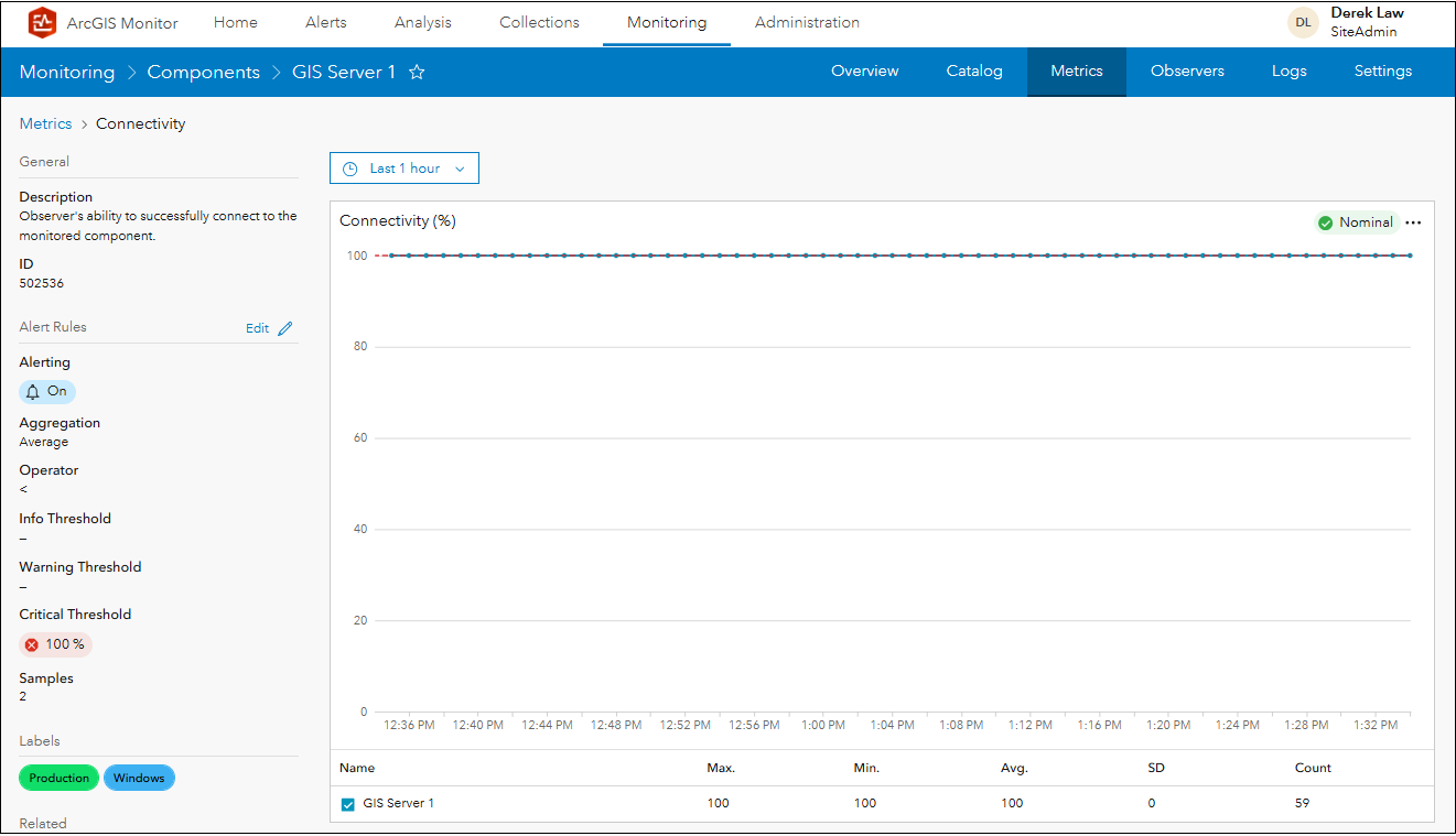 One notable metric found in most registered components is connectivity. This metric is an indicator of whether or not Monitor can connect to the component to collect data. For example, GIS Server 1’s connectivity metric reports 100% connectivity with a nominal status in Figure 17.