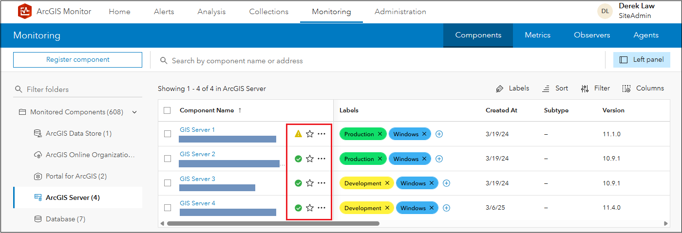 When an enterprise GIS asset such as an ArcGIS Server site is registered with Monitor, it becomes a component. Each component’s status is shown on the Monitoring page in the components table:
