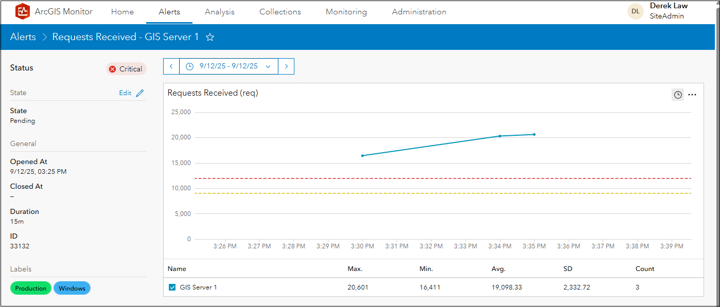 Monitor navigates to the Alerts page and displays the requests received metric with the active alert in more detail. Note that the collected data for the metric has exceeded the critical alert threshold (represented by the red dotted line in the serial chart). This triggered the critical alert and changed GIS Server 1’s component status from warning to critical. On the left side panel, note the critical alert was opened on 9/12/25 at 3:25 pm.