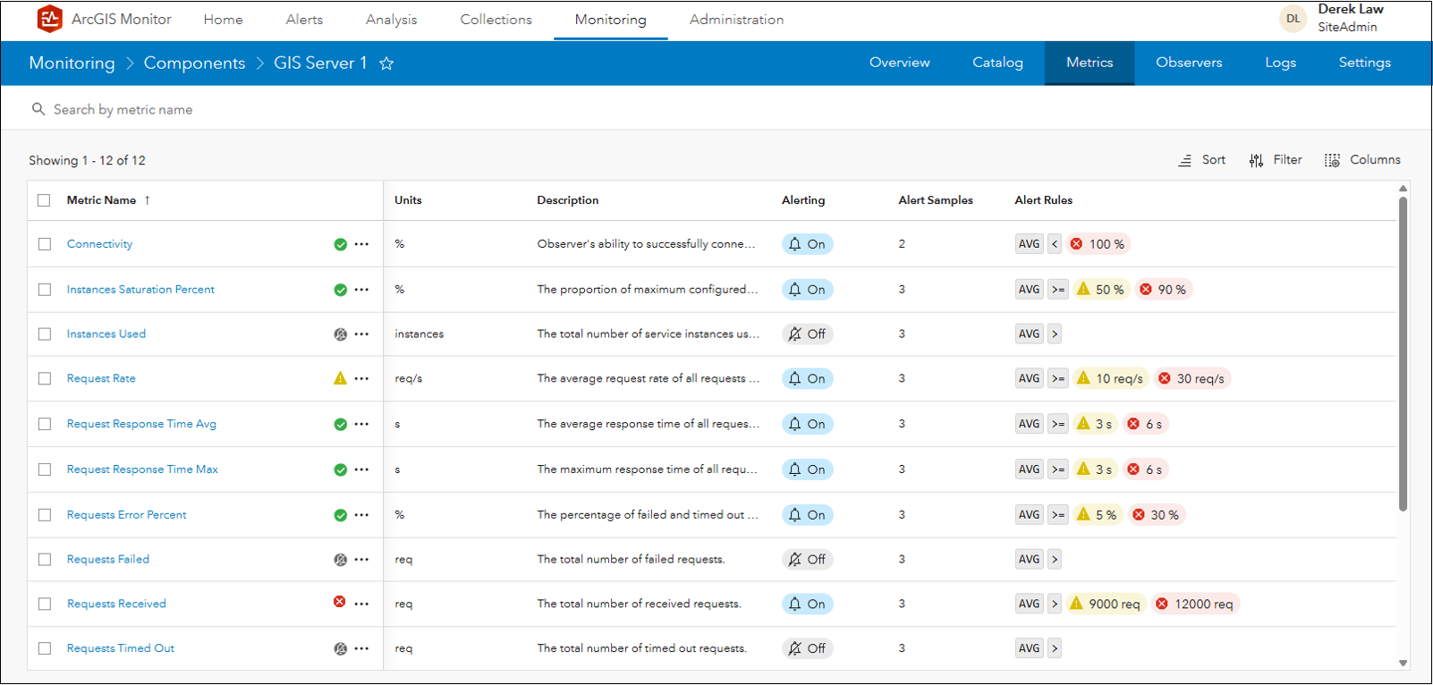 For all registered components in ArcGIS Monitor, admins can configure and enable alerts for any collected metric. You can view all the metrics for a component and their respective alert rules by navigating to the Monitoring page > select a component > Metrics subtab. For example, the metrics for GIS Server 1 are shown in Figure 7; you can learn more about each metric in the ArcGIS Server metrics help topic. Each component type’s metrics are explained in the Monitor help.
