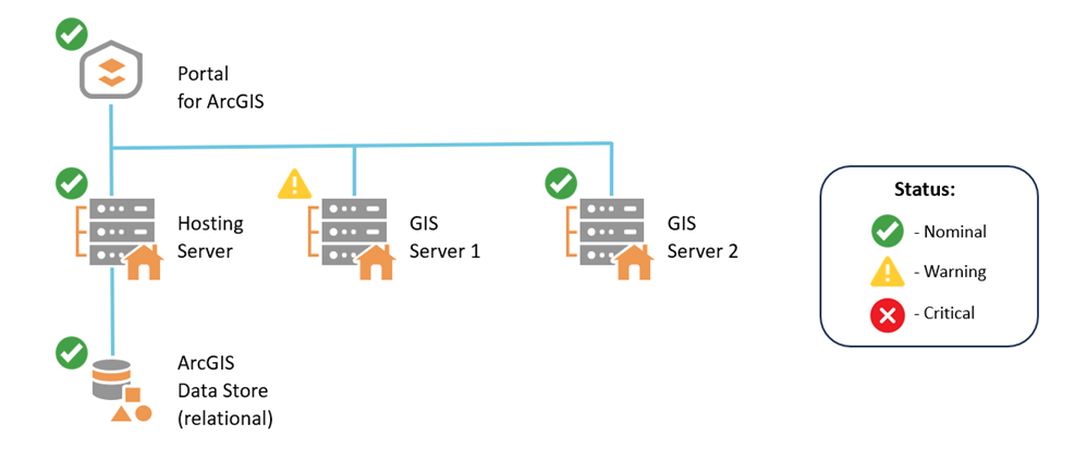 Figure 1: Conceptual diagram ArcGIS Enterprise deployment with one of its GIS Servers showing a warning status.