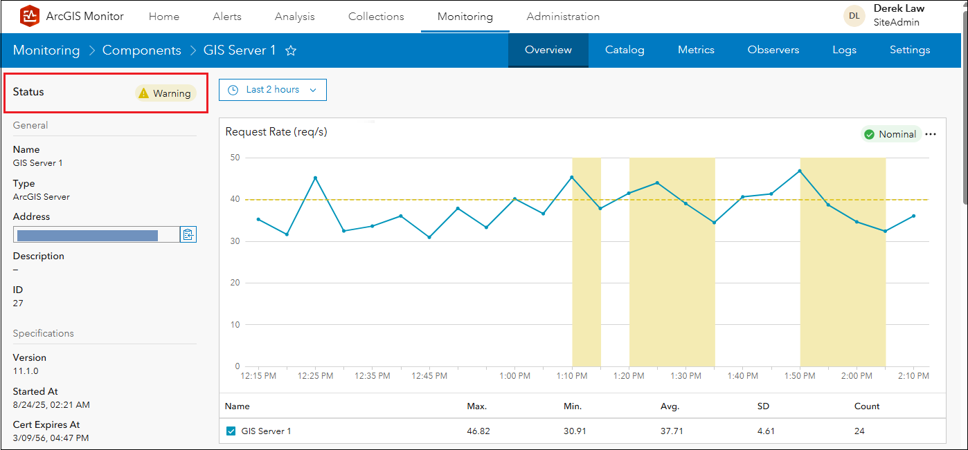 GIS Server 1’s current status is warning. While it may seem like the request rate metric may have triggered the component warning status, it did not. In the request rate serial chart, the yellow dotted line represents the warning alert threshold value set to 40 requests per second for the metric. There are three time periods where the collected data exceeded the warning threshold and they are shown as yellow regions in the chart. Note the chart’s status pill indicator in the upper right shows nominal.