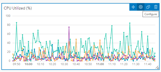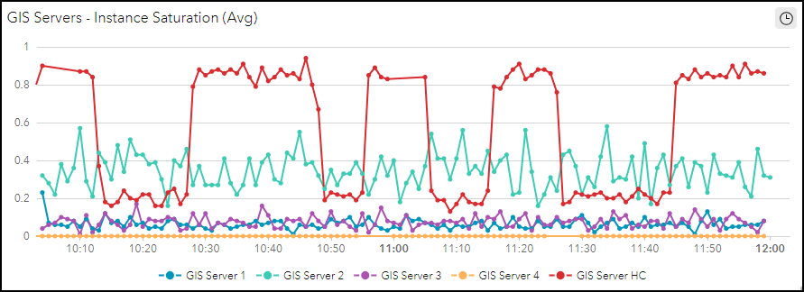 For example, a useful report metric is ArcGIS Server instance saturation (%) – this property describes the proportion of configured service instances in use, where high values indicate that more instances are needed to handle incoming service requests. A serial chart element can be configured to display the instance saturation (%) for all registered ArcGIS Server sites in Monitor. The data expression for ArcGIS Server instance saturation is: