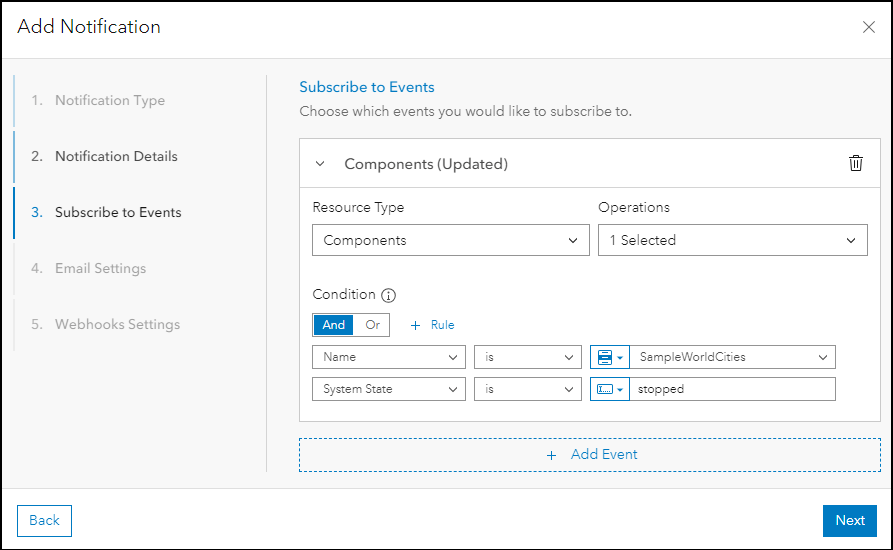 For Subscribe to Events click +Add Event, for Configure Event – Resource Type select “Components”, and for Operations select “Updated”. Then for Condition click +Add Condition, select Name is <web service name>, then click +Rule, and select System State is, type in “stopped”. Create notifications in Monitor as needed to support how you manage your organization’s enterprise GIS.