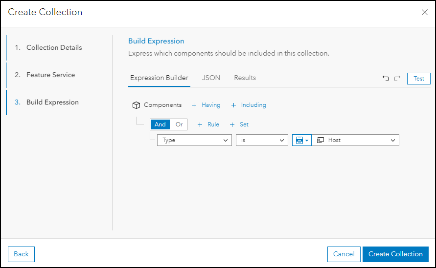 To define a new collection in ArcGIS Monitor, navigate to the Collections tab > Create Collection button. The Create Collection wizard appears, where you can give the collection a name and description, enable a feature service (optional), and specify the data expression that determines which components will participate in the collection. Collections should align with your organization’s management practices. Learn more about collections.