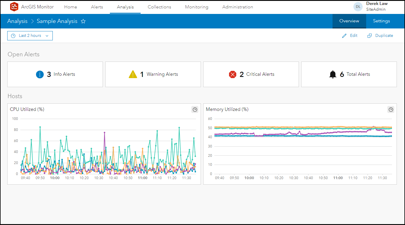 The Analysis capability in ArcGIS Monitor provides an expression builder experience to define data expressions and display them in an Analysis view (i.e., a dashboard layout). This allows you to select the data metrics you’re interested in viewing from the components registered with Monitor. Constructing data expressions and Analysis views enables you to create your own custom reports on collected data metrics. An Analysis view can report the data metrics for many different use cases ranging from a high-level overview of enterprise GIS health to monitoring critical components of the organization.