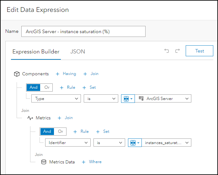 For help on constructing data expressions, review the metrics reference which describes the ArcGIS Monitor information model.