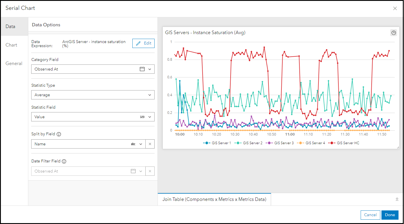 The data expression shown selects all components of type “ArcGIS Server”, queries their data metrics, and filters for the “instance_saturation” data. After the specific data metrics are queried, the serial chart element can be configured to display the average instance saturation observed: