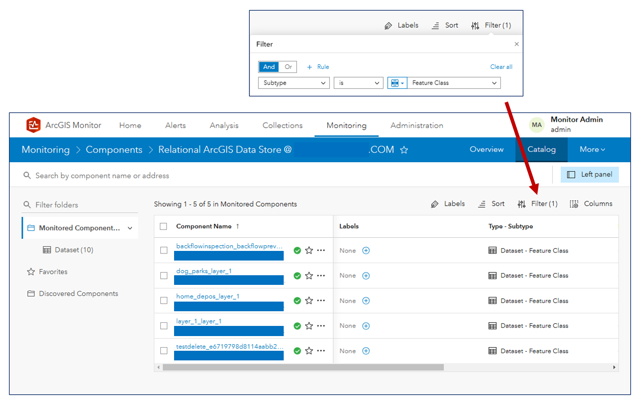 Registering an ArcGIS Data Store also adds a new child component type called Dataset, where each dataset component represents a table within the Data Store. If you select an ArcGIS Data Store in the components table, then click the Catalog subtab, you can view all of its dataset components. By default, Monitor will display all tables – to only show a list of hosted feature classes stored in the ArcGIS Data Store, you can apply a filter on the components table (e.g., Subtype is Feature Class), see Figure 3. Selecting a dataset component in the components table will display its geometry type and its metrics: rows total and storage used.