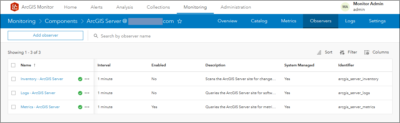 Every component in ArcGIS Monitor has observers which are responsible for collecting attribute and metric information about the component. Each component type has a unique set of observers that run at specified intervals. You can view the observers for a component by selecting the component on the Monitoring page > Observers subtab. For example, an ArcGIS Server component has three observers: inventory, logs, and metrics – see Figure 6.