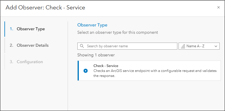 This is enabled under Monitoring > select an ArcGIS Server component > Catalog subtab > select a web service (to apply the Check-Service observer) > Observers subtab > then click Add observer. This will display the Add observer panel as shown in Figure 7. Learn more about working with the Check-Service observer in this help topic.