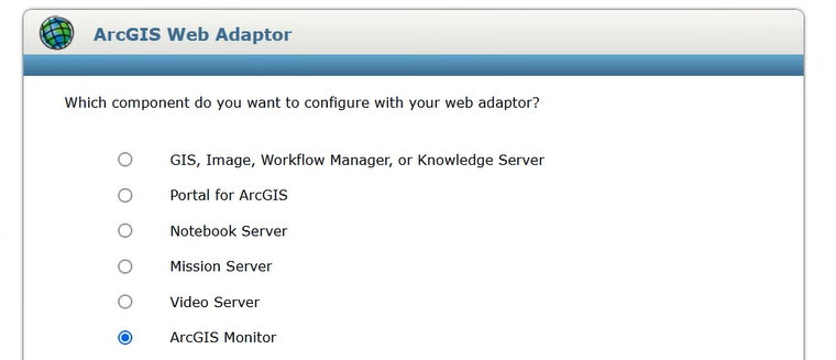 Starting at Monitor 2024.1, ArcGIS Web Adaptor 11.4 can be configured to proxy requests to ArcGIS Monitor. When setting up the ArcGIS Web Adaptor, one of the options is to configure it to work with ArcGIS Monitor, see Figure 9. This can help provide better security for accessing the Monitor web app. Learn more in this help topic.