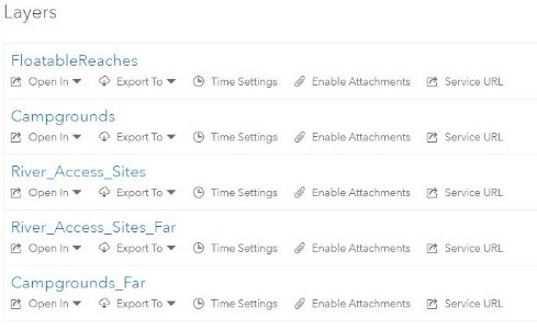 The three feature classes are: floatable reaches, access points and campsites. Floatable reaches are recreational river segment polylines that are referenced from the National Hydrography Dataset. Access points and campsites are point data showing locations where river segments can be accessed by boat, and where waterside camping exists.