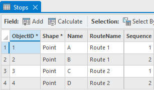 Revisit the example with four stops, but this time, use the RouteName field to split the four stops into two routes. Stops A and B both have a RouteName field value of Route 1, and Stops C and D have a RouteName field value of Route 2.
