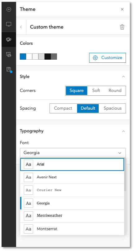 In the Custom Theme configuration, navigate to the Typography section and select a new font from the Font drop-down menu.
