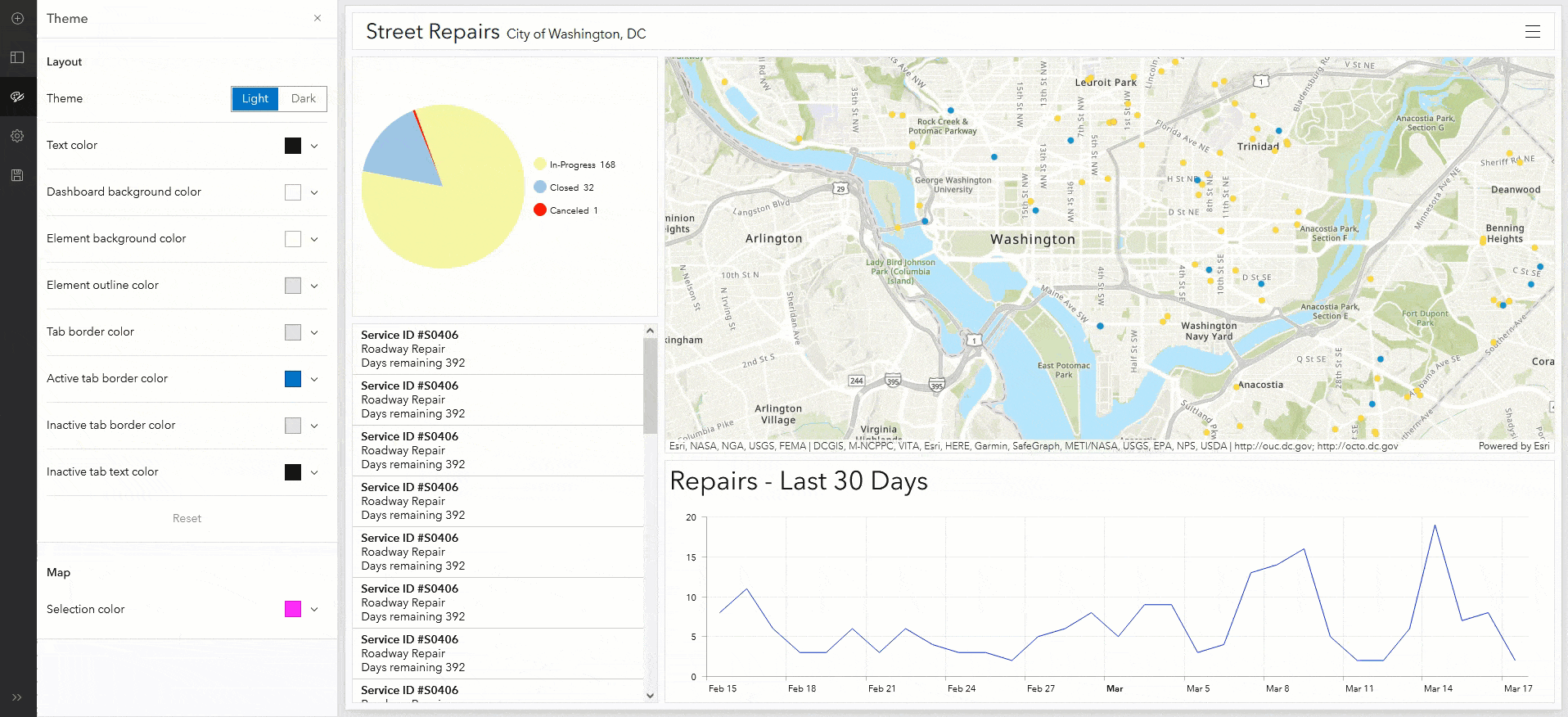 Dashboard theme settings are now available directly from the toolbar. You can click the theme button to open the new Theme pane, and make changes to your dashboard’s colors and theme while still previewing your dashboard.
