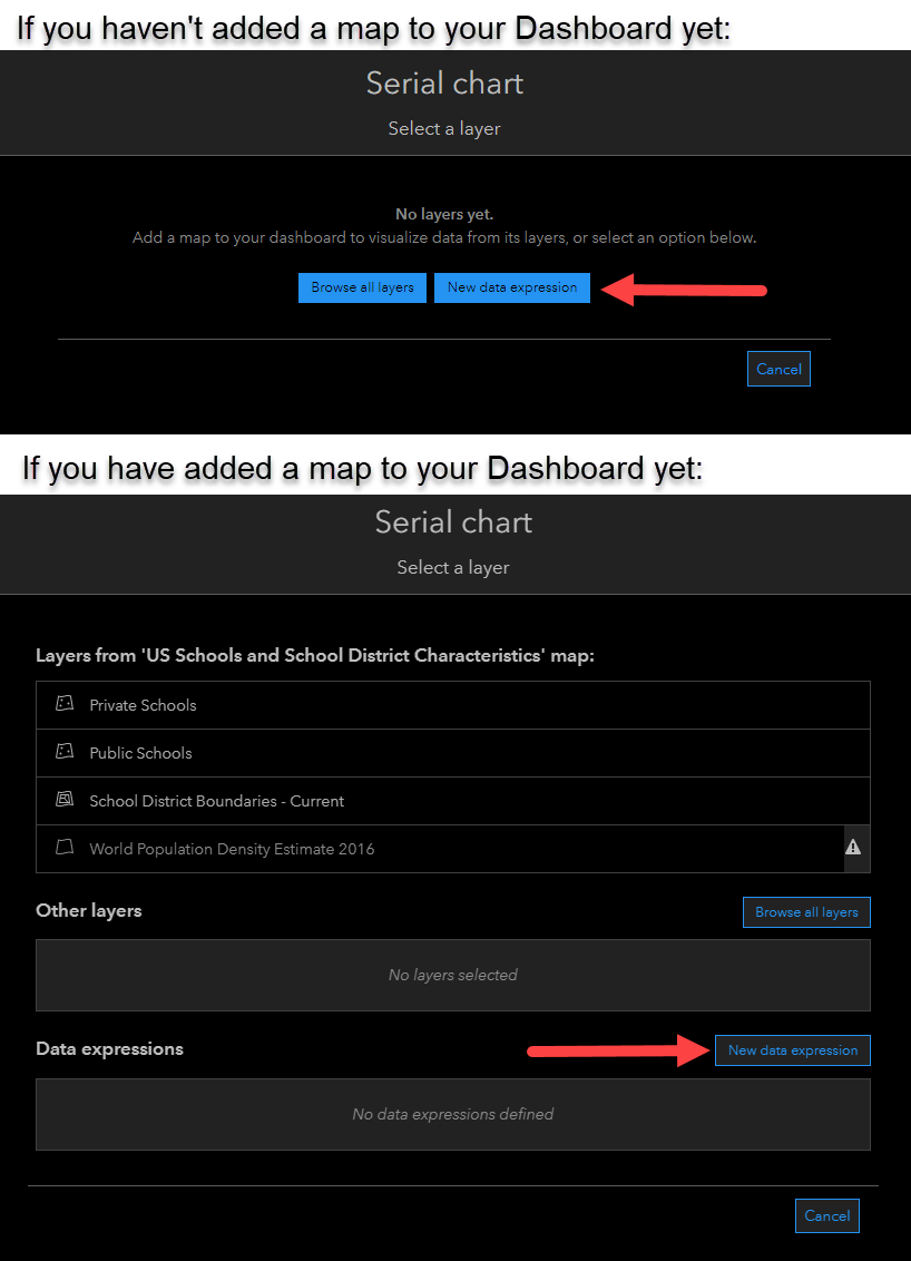 For each layer you want to access, you’ll create a Data Expression for that layer. You can reuse Data Expressions, so once you only have to write the expression once. To do so, add an element to your dashboard and choose to add a Data Expression instead of a layer from your map.