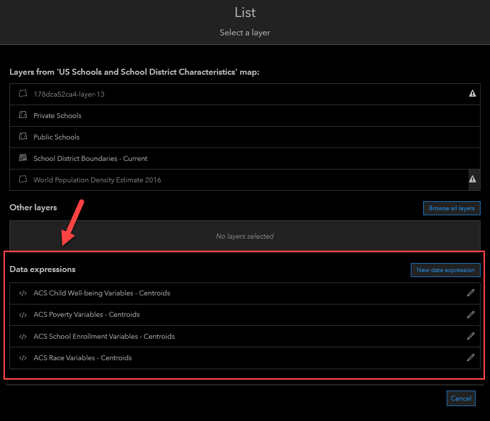 I’ll follow the same process to bring in the other three ACS layers from Living Atlas. You can even re-use a Data Expression for multiple indicators/charts by accessing your Data Expressions the same way you access layers from the map.