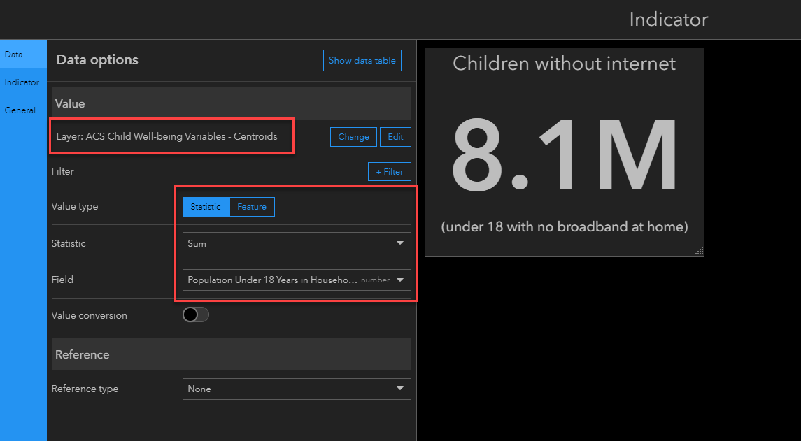 Now that the dashboard knows which layer to access, you can build indicators or charts into your dashboard as you would with any other layer. In this example, I want to filter the Census Tracts by the school district boundaries in order to see how many children have no broadband internet at home. This is a field from the layer I just brought in, so I can configure as normal.
