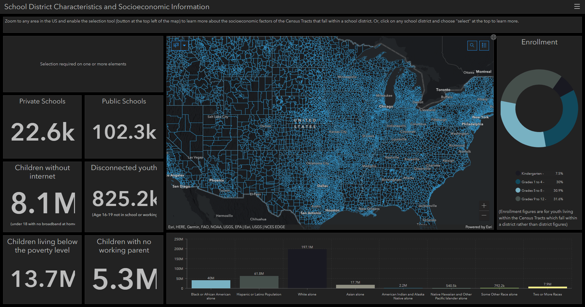 Here’s an example dashboard showing school districts in the US along with socioeconomic characteristics related to the population living within that school district. You can use the select tool on the map to learn more about the schools in a district, see the racial profile of the population living within the district, or gain insight about how many children are facing hardships within that district. You can see how the various indicators change from district to district, providing a comparison of the community characteristics.