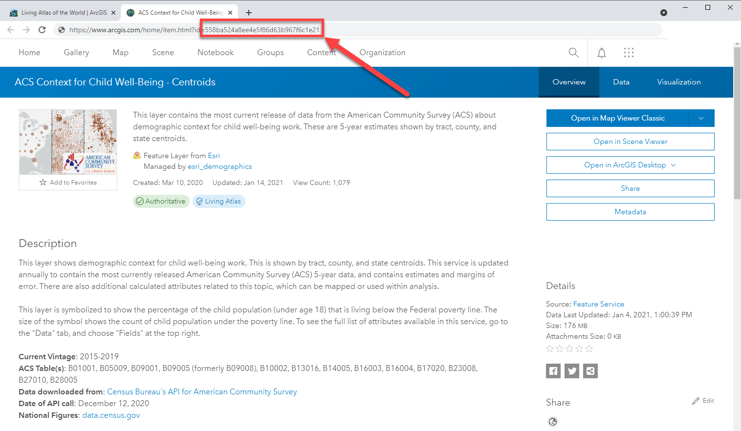 Once you have found a layer you want to use, the item ID can be found in the URL: