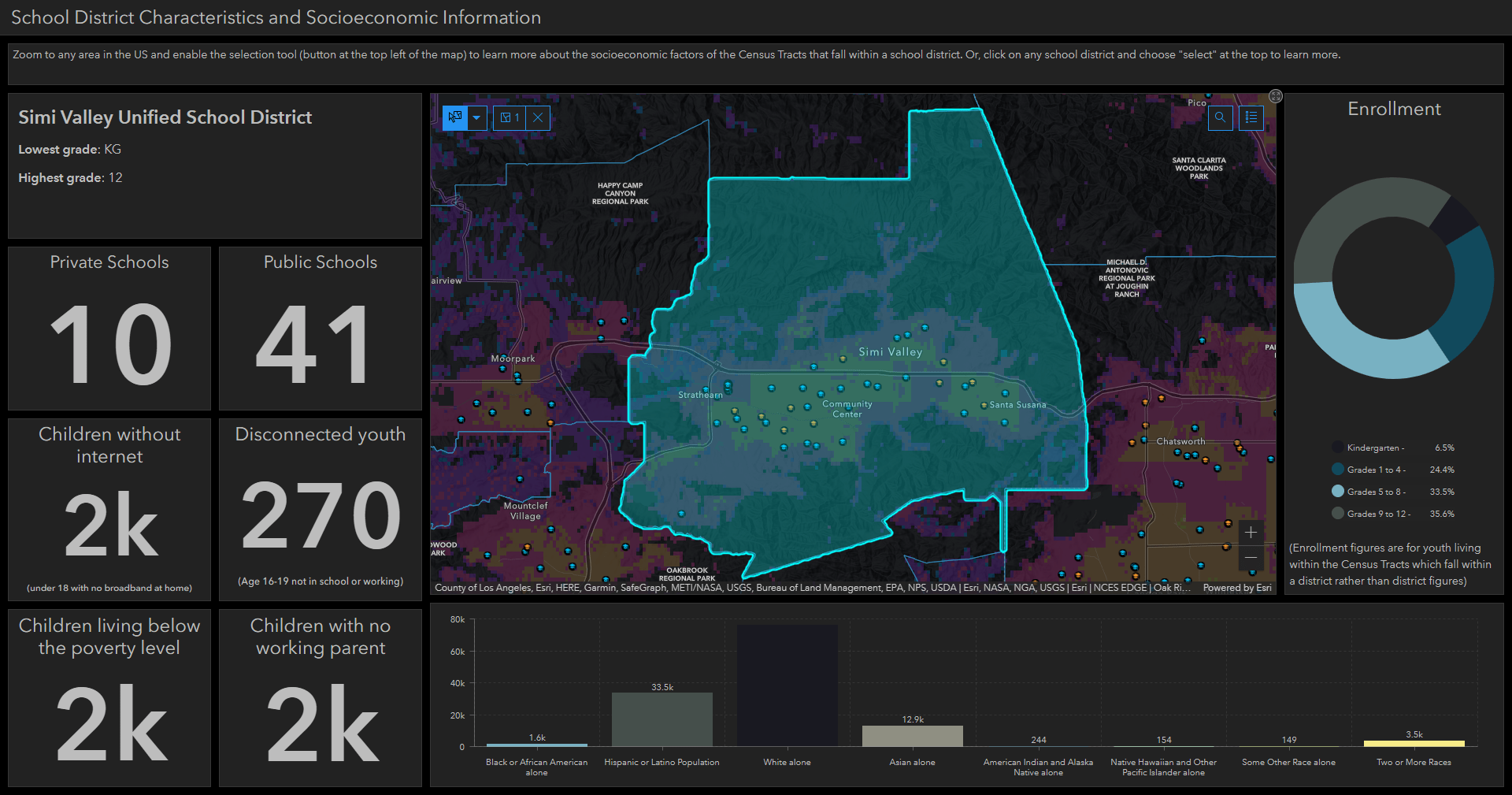 Now, when someone clicks on a district, they get a comprehensive view of the socioeconomic factors of the people who live within that district. We can see the racial breakdown of the people who live there, the enrollment of students living within that district, as well as factors related to at-risk students: