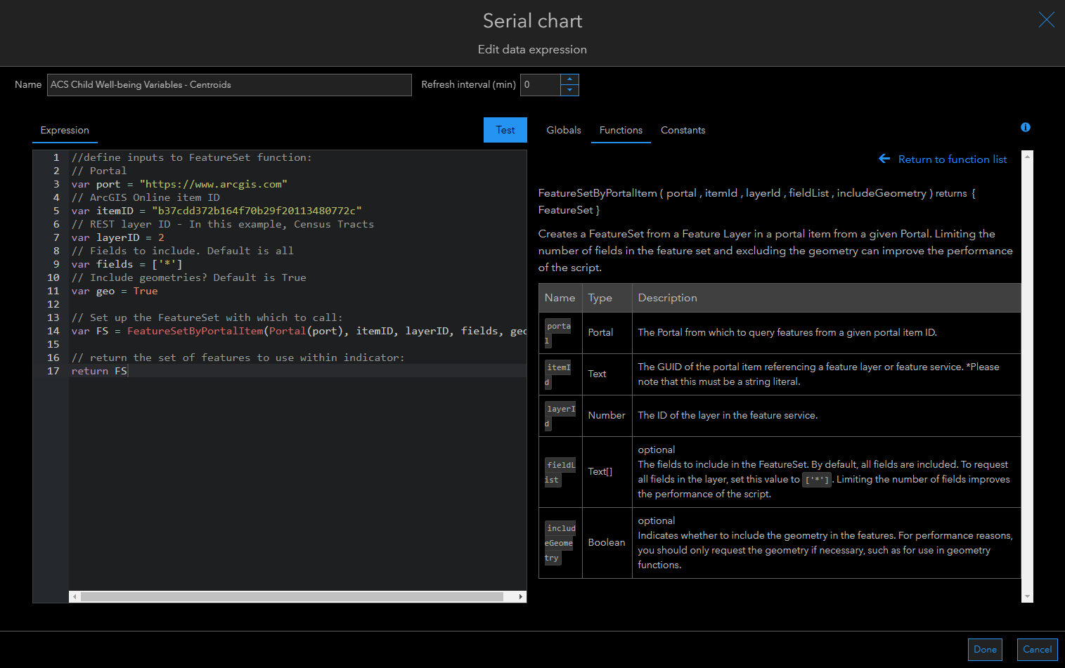 You’ll then use the FeatureSetbyPortalItem function to access the layer. The interface has built-in help for how to use this function (seen on the right in the screenshot below), but you can also copy the code snippet below.