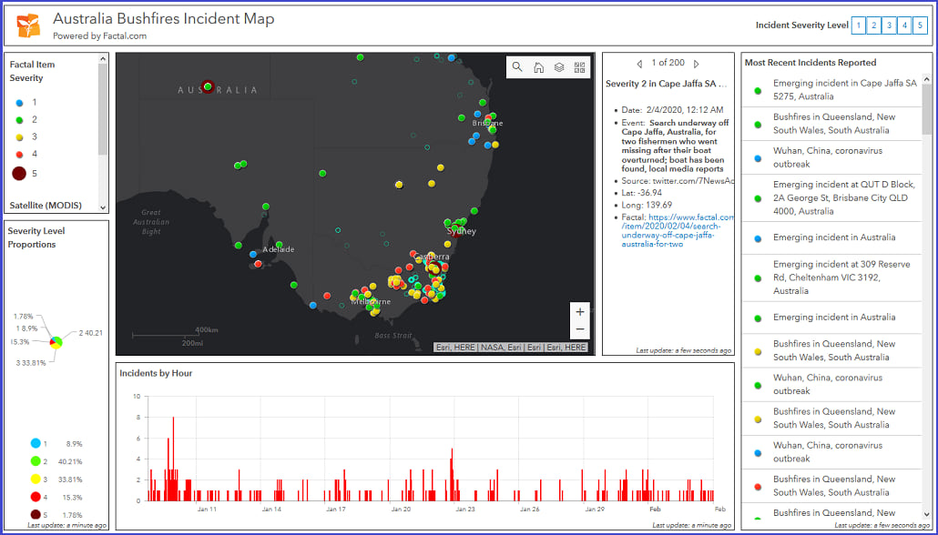 I work with the team that creates Operations Dashboard for ArcGIS, a configurable web app that enables the creation of dashboards. A dashboard is typically a single display that visualizes data with charts and gauges (showing key performance indicators – KPIs), enabling the monitoring of assets and resources in real-time. In January 2020, there were several dashboard examples created with Operations Dashboard that have (and still are) helping with the emergency response efforts of these events. I wanted to share these examples and highlight the power of dashboards in the ArcGIS Platform.