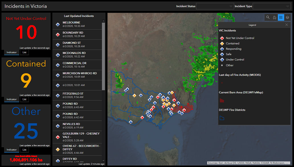 Another dashboard to help notify the public about the bushfire status in the state of Victoria was created by Simon Jackson from esri Australia.
