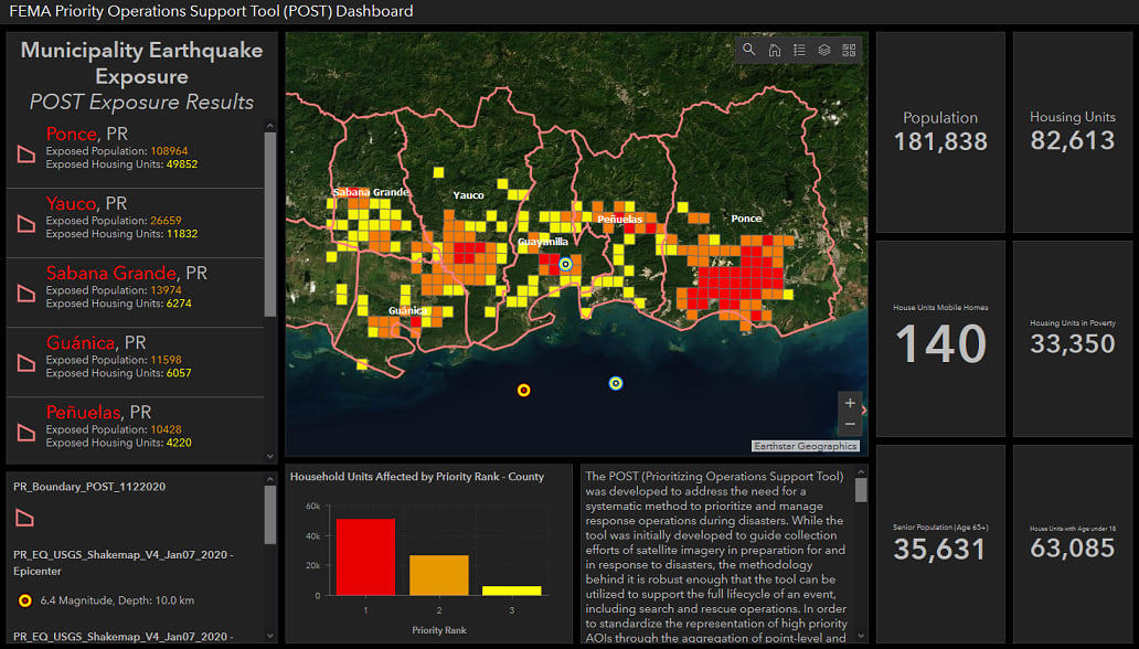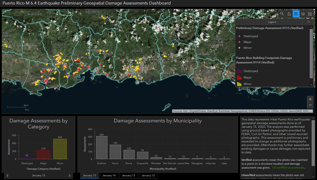 On Jan 7, the southwestern part of Puerto Rico was hit by a magnitude 6.4 earthquake; this followed several smaller earthquakes that occurred previously. To help with emergency response efforts, the US Federal Emergency Management Agency (FEMA) created several dashboards to help with their operations.